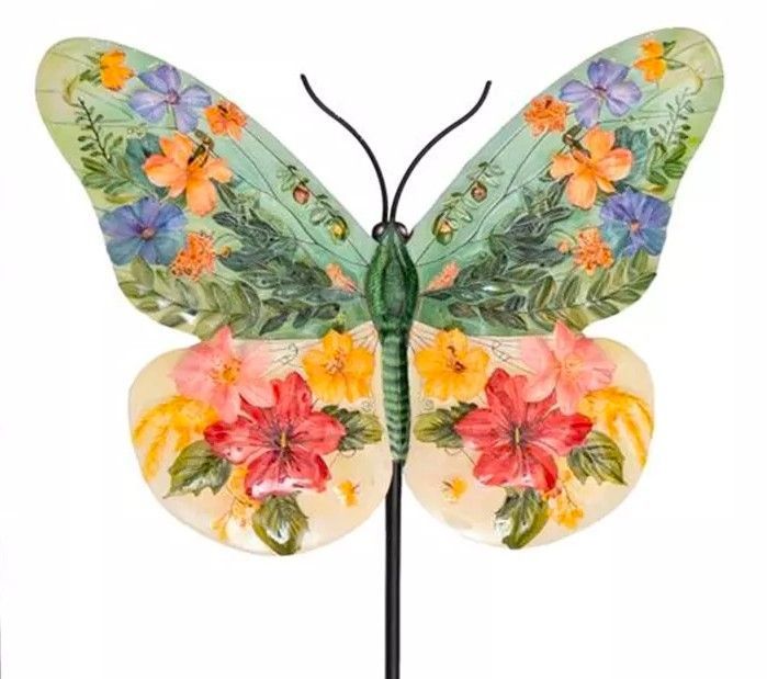 mooie vlinder met bloemenprint op een steker in mooie kleuren.