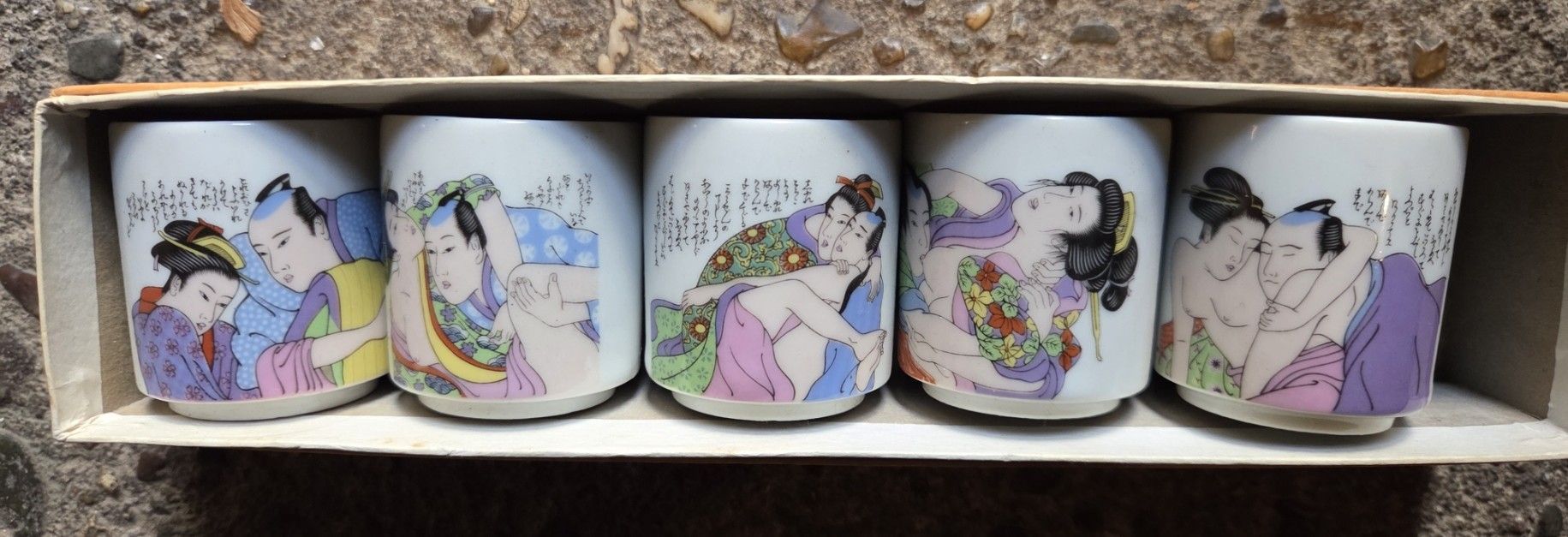 Set van 5 kleine porseleinen sake - thee kopjes versierd met Kama Sutra Print-thema's